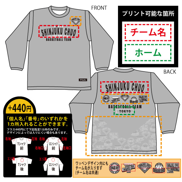 +330円で「個人名」「番号」のいずれかを1カ所入れる事も出来ます。※デザインによっては入りにくい場合もあります